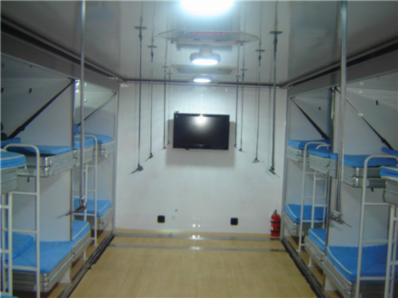 3)酒店住宿总数:12/24人车辆改装设计方案:全车改裝设计方案符合我国对汽车技术改裝的有关规定;在确保运输工具行车安全性的前提条件下,灵活运用底盘的重力梯度及汽车底盘规格;能考虑车截安装设备、运作和工作人员工作中、生活需要。4)汽车驾驶室汽车驾驶室內部:汽车驾驶室数人1+两人设定,适用远途安全驾驶,配备制热空调。司机坐椅可调整高宽比、视角、前后左右部位,司机及前座坐椅带保险带。长排信号灯一个,合乎GB13954-2009要求,电子器件报警器一个合乎GB8108-2014要求,东风天锦宿营车